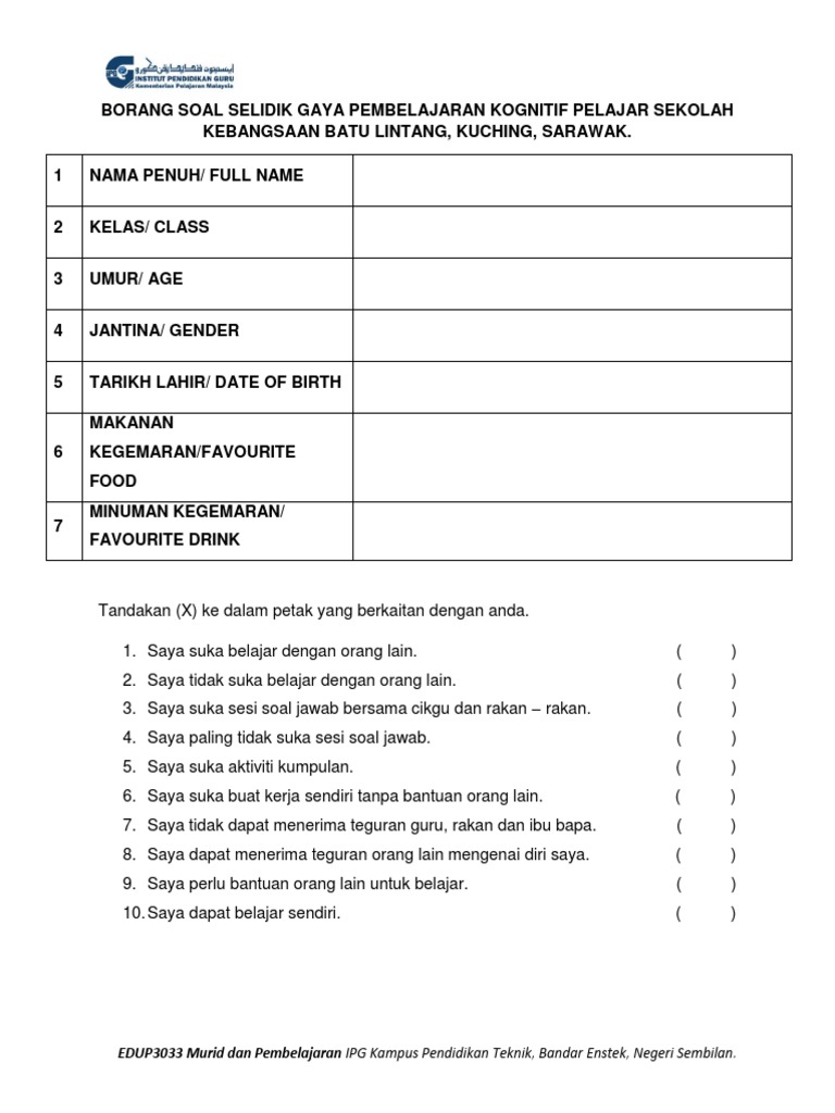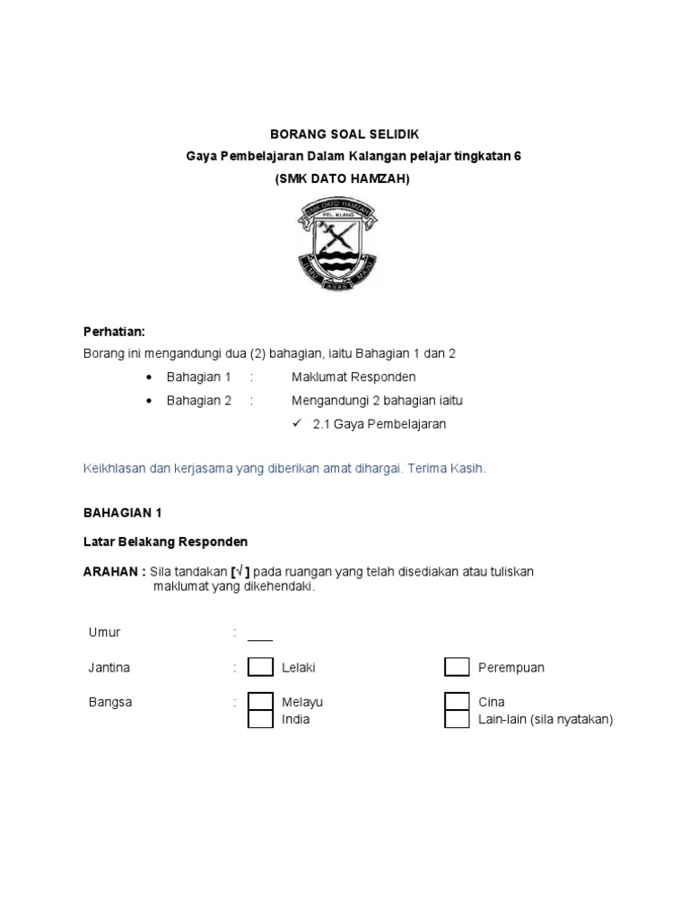 Temu bualtemu bual ialah pertemuan dengan seseorang untuk bersoal jawab atau menyoal untuk mendapatkan berita dan sebagainya. Ssaran yang diberikan (1) gaya kepemimpinan kepala sekolah yang belum baik. Gaya kepemimpinan dapat menentukan keberhasilan suatu perusahaan. Penemuan kajian ini amat berguna dalam membantu pihak pengurusan merancang dan melaksanakan program yang bersesuaian di masa hadapan. Dalam hal ini, dalam setiap lingkup kepemimpinan. Kurang sederhana secara berlebihan borang soal selidik tentang gaya pemakanan. Materi kepemimpinan dalam organisasi, kepemimpinan adalah suatu proses untuk memengaruhi atau memberikan contoh kepada pengikut oleh seorang pemimpin yang mana ditujukan untuk mencapai tujuan organisasi. Sebagai pemimpin, kamu harus memberi instruksi soal apa yang harus dikerjakan dan sebagainya. Borang soal selidik guru pbs by nishandra shan 1296 views. Teori gaya kepemimpinan lebih berfokus pada apa yang sebenarnya dilakukan oleh seorang pimpinan daripada melihat siapa yang memimpin. Kertas penyelidikan hubungan gaya kepemimpinan pengetua dan kepuasan kerja guru di sekolah menengahdaerah kuala terengganu utara. Soal selidik kemudahan dan prasarana by kelana cah 696 views. Mulai dari lingkup yang terkecil hingga yang terbesar sekalipun.