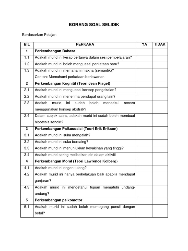 Trainees2013: Borang Soal Selidik Zakat from agri.upm.edu.my Teori gaya kepemimpinan berfokus pada dua jenis perilaku utama, yaitu perilaku tugas dan perilaku hubungan. Sebagai pemimpin, kamu harus memberi instruksi soal apa yang harus dikerjakan dan sebagainya. Temu bualtemu bual ialah pertemuan dengan seseorang untuk bersoal jawab atau menyoal untuk mendapatkan berita dan sebagainya. Contoh borang soal selidik kerja kursus pengajian amfull description. Borang soal selidik kantin sesi 2014/2015. Mulai dari lingkup yang terkecil hingga yang terbesar sekalipun. Yuk, mulai pelajari beberapa gaya kepemimpinan. Biasanya, gaya kepemimpinan ini terjadi dalam perusahaan dengan sistem dan prosedur yang sudah diatur sebelumnya dan sudah terbentuk sejak lama.