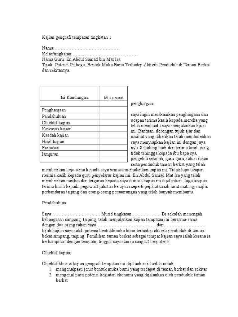 Saya telah membuat pemerhatian terhadap kawasan kajian untuk mendapatkan maklumat tentang kegiatan ekonomi di kawasan kajian.saya telah memerhati wpnonce=4bf7f26e87.selain itu saya juga telah menggunakan buku teks geografi tingkatan 1 untuk memudahkan saya membuat kajian ini. Start studying geografi tingkatan 1: Ojektif kami membuat kajian ini adalah untuk mengkaji kesan pembinaan jalan raya,kilang dan taman.di kawasan besout ini. Objektif khusus kajian geografi tempatan ini dijalankan adalah untuk: Bentuk muka bumi bab 7.